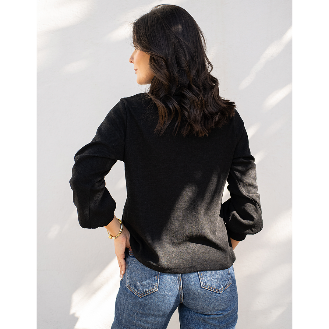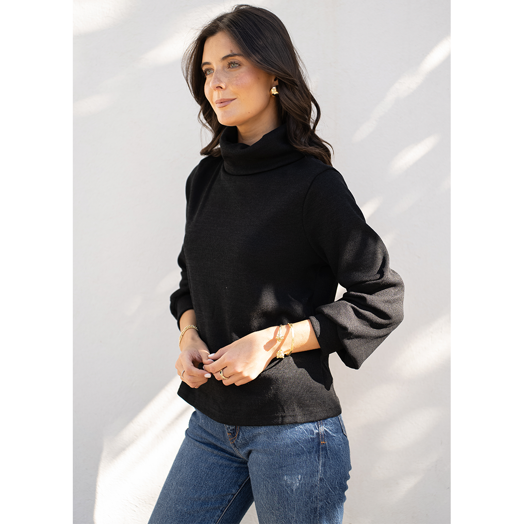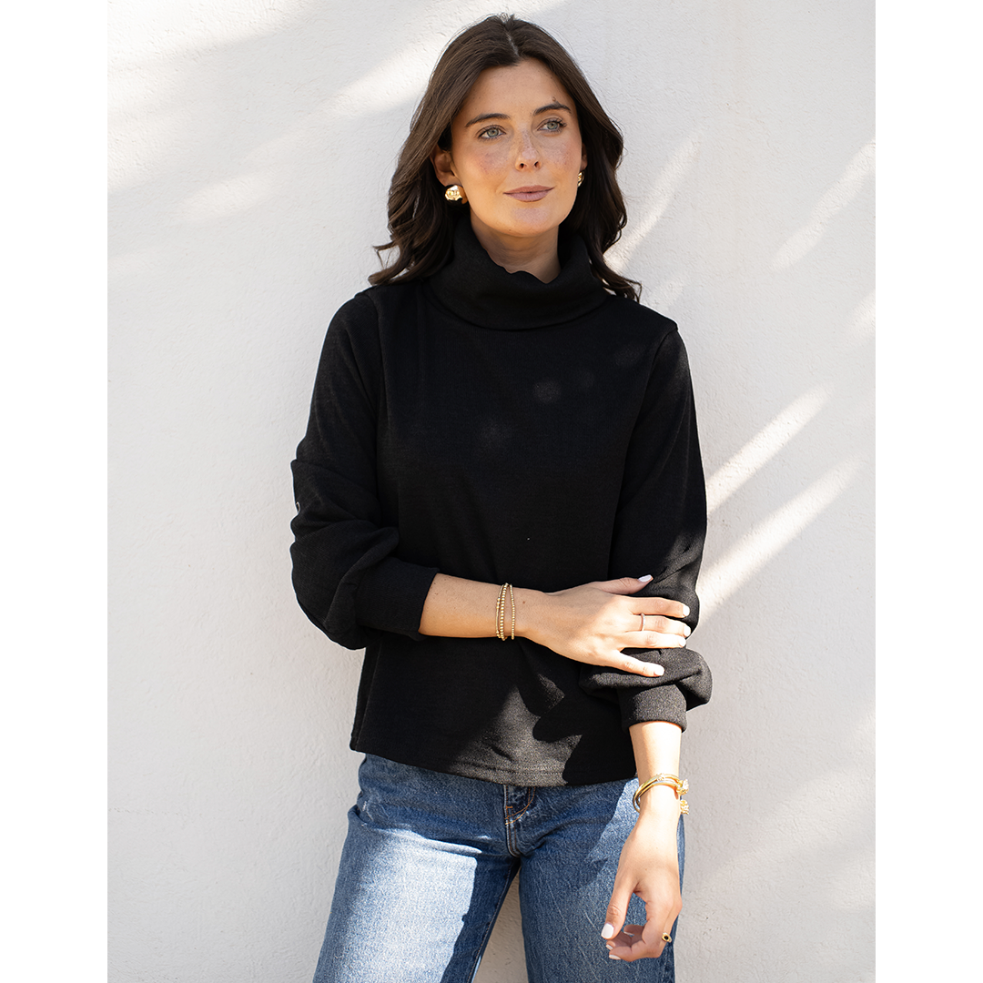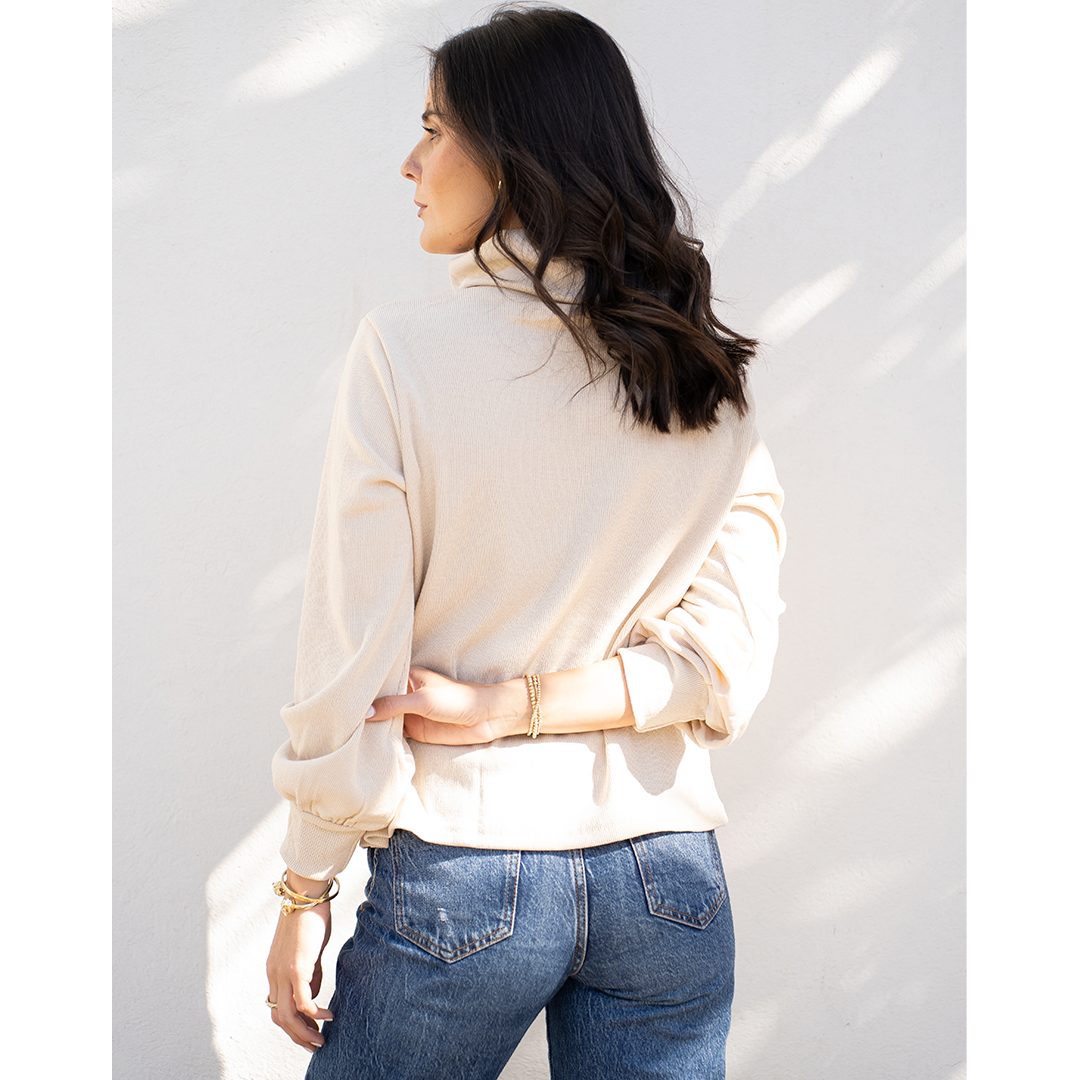 Chaleco con semi look de poleron. Tiene cuello subido y una pretina en la manga que hace que se forme una manga globo.