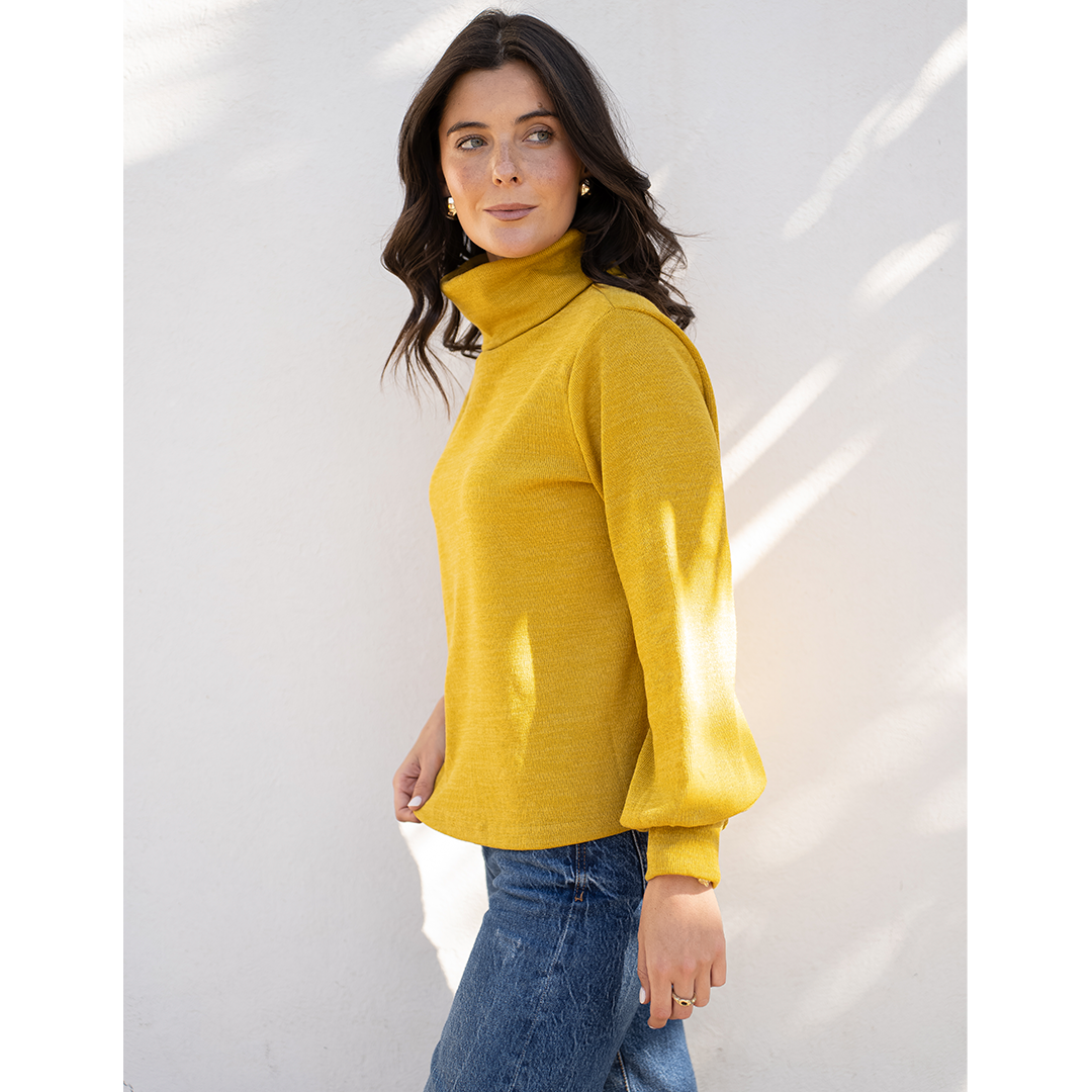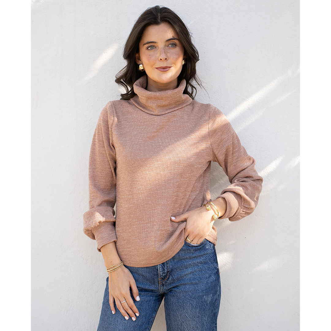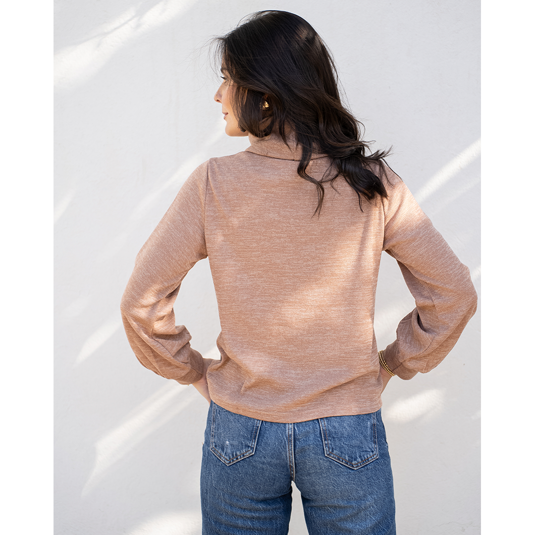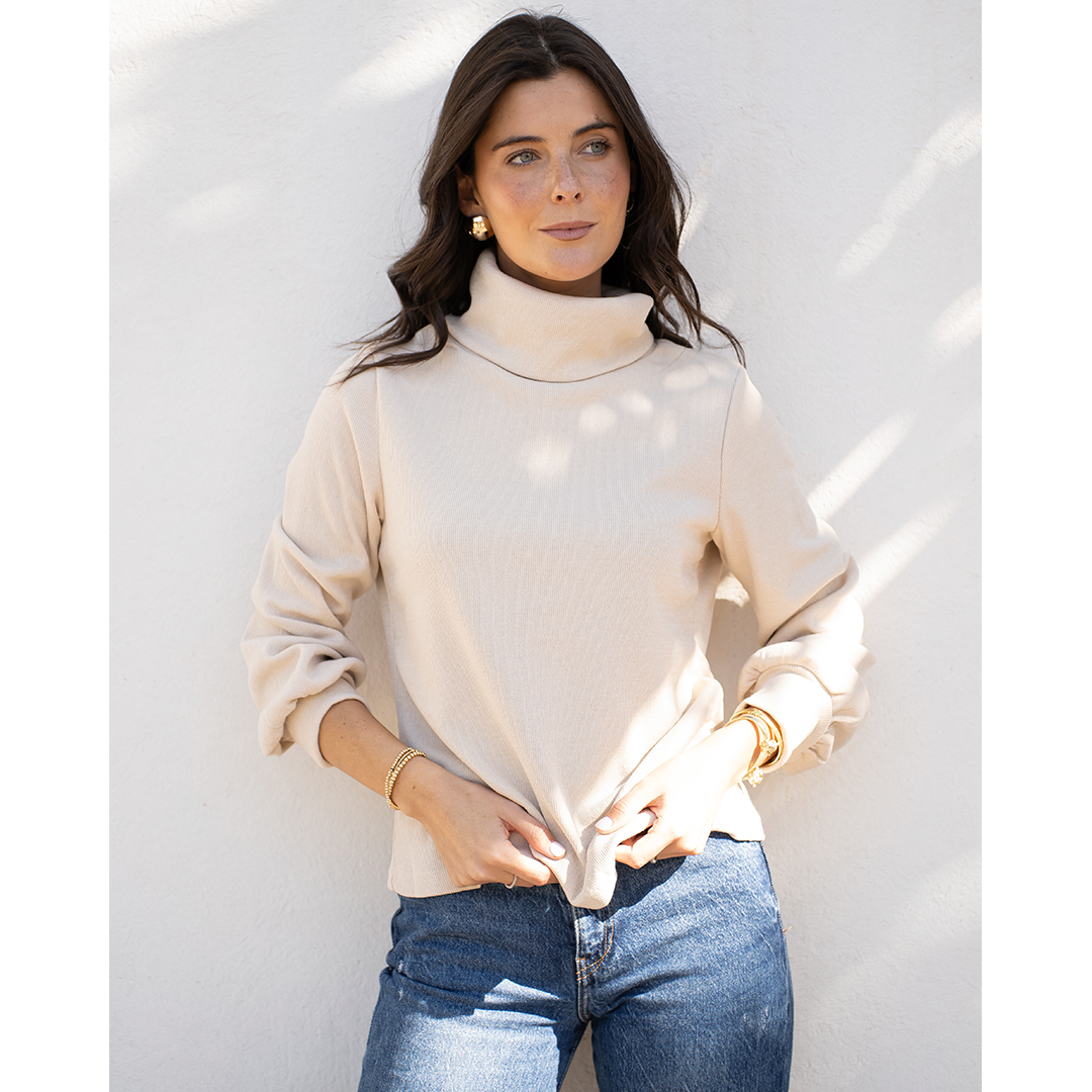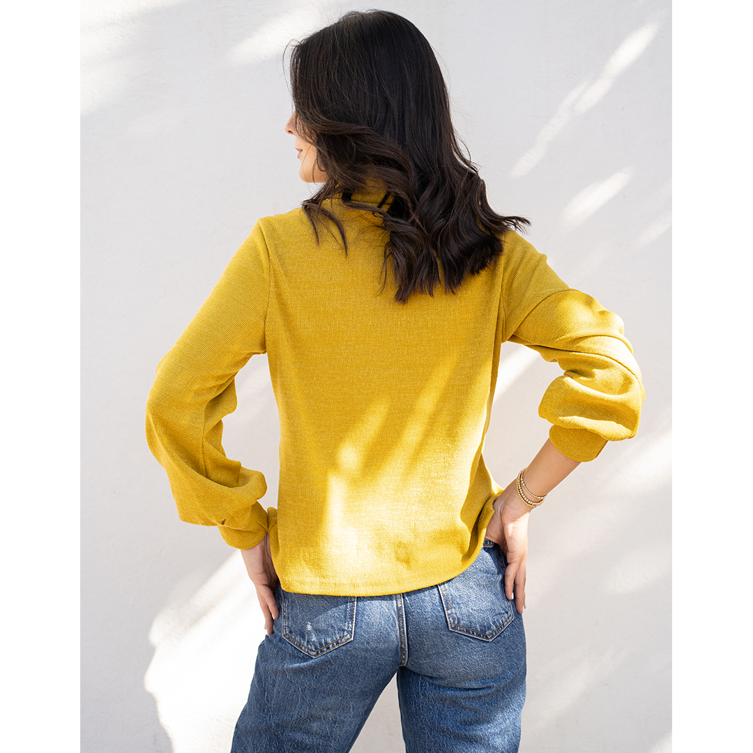 Chaleco con semi look de poleron. Tiene cuello subido y una pretina en la manga que hace que se forme una manga globo.