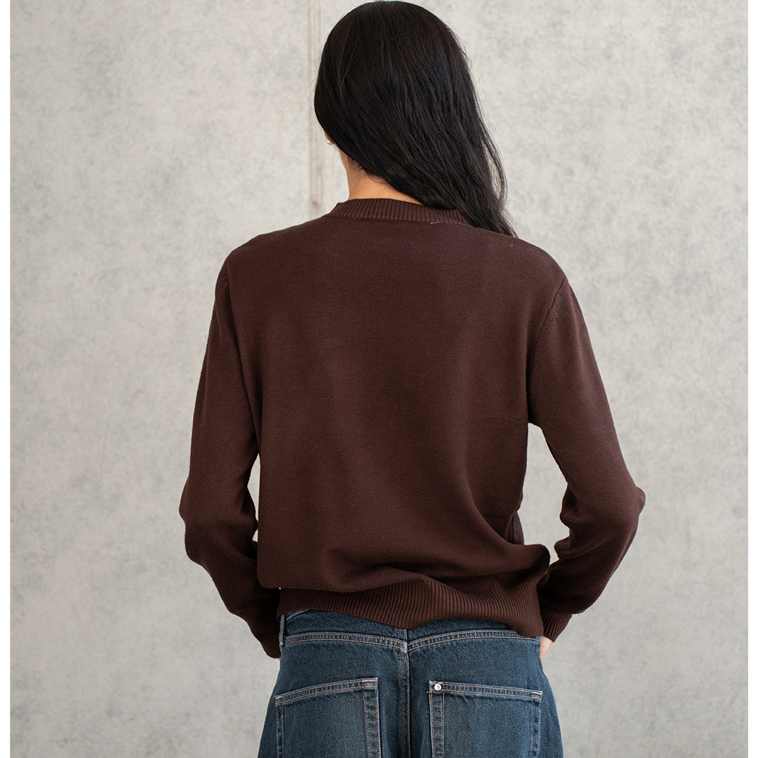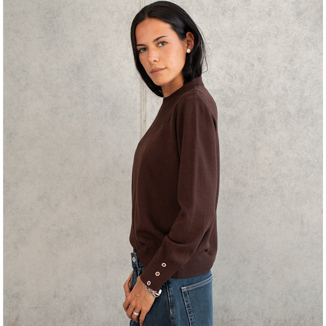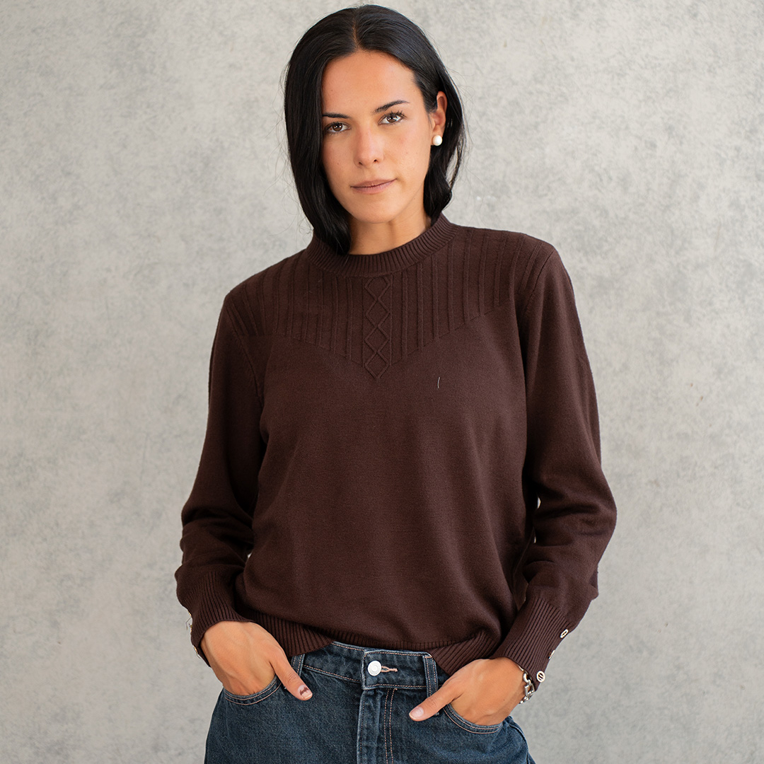 Un sweater que combina minimalismo con detalles de diseño. Destaca por su pechera con textura acanalada vertical que nace desde el cuello, creando un efecto visual que alarga y estiliza la figura. Sus botones metálicos en los puños lo convierten en la prenda perfecta para quienes buscan un básico con un "algo más".