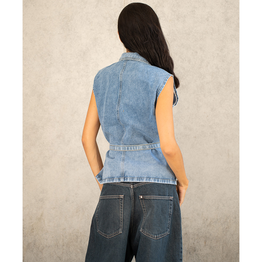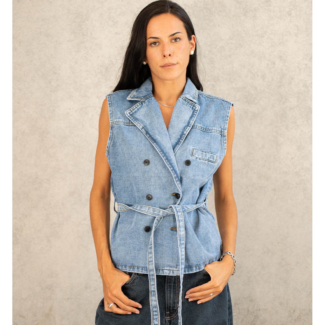 Chaqueta sin mangas de mezclilla rígida con cuello, botones de metal delante. Modelo de corte y cinta ajustable para darle ajuste a la figura.