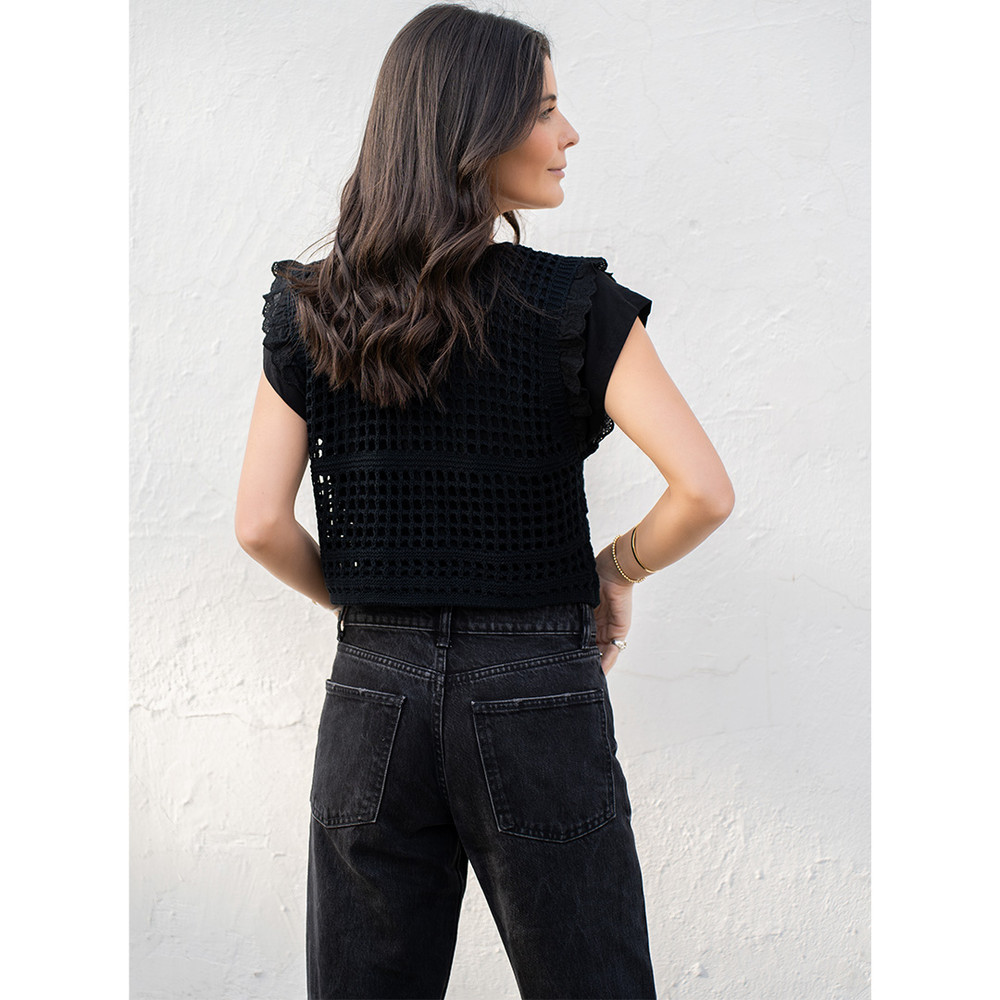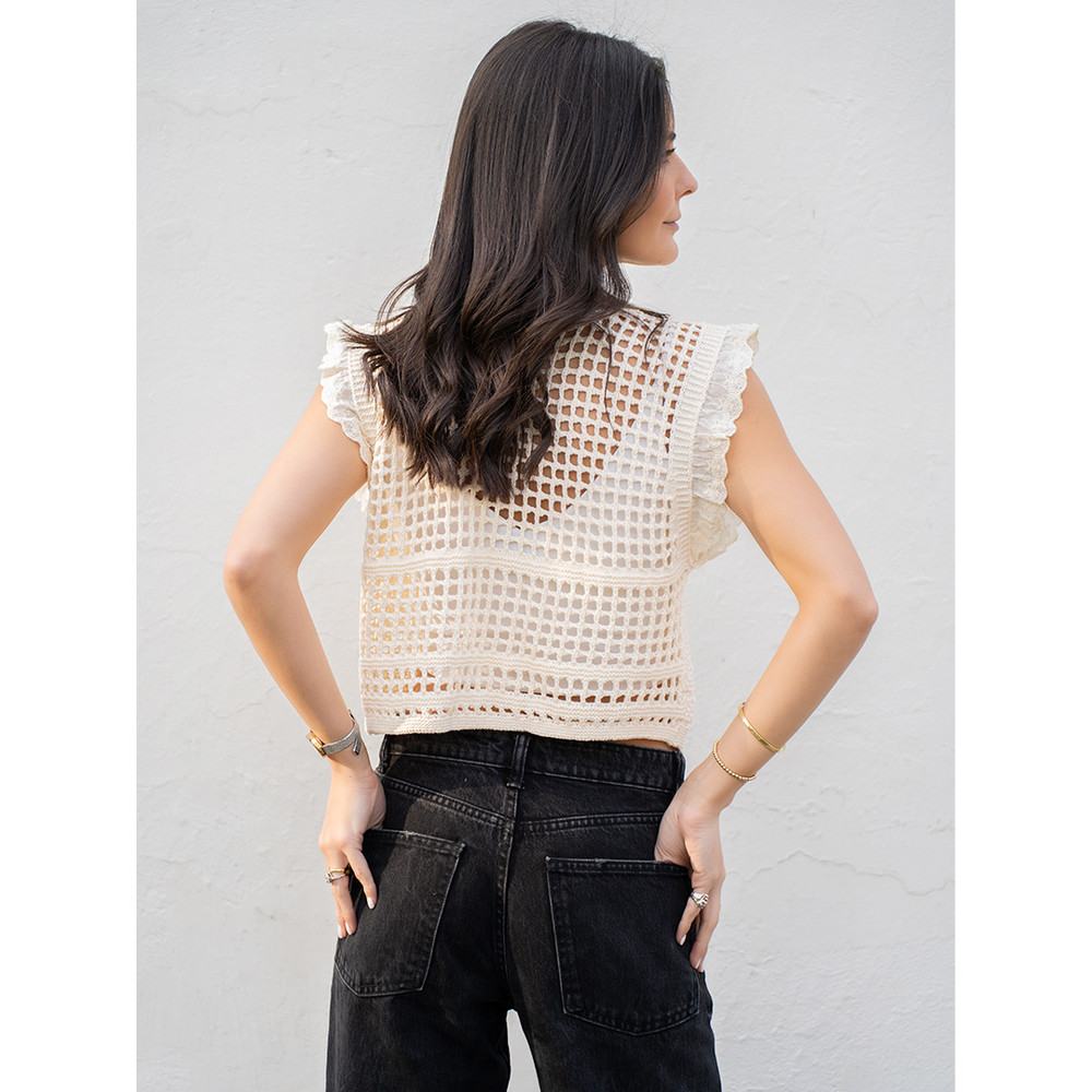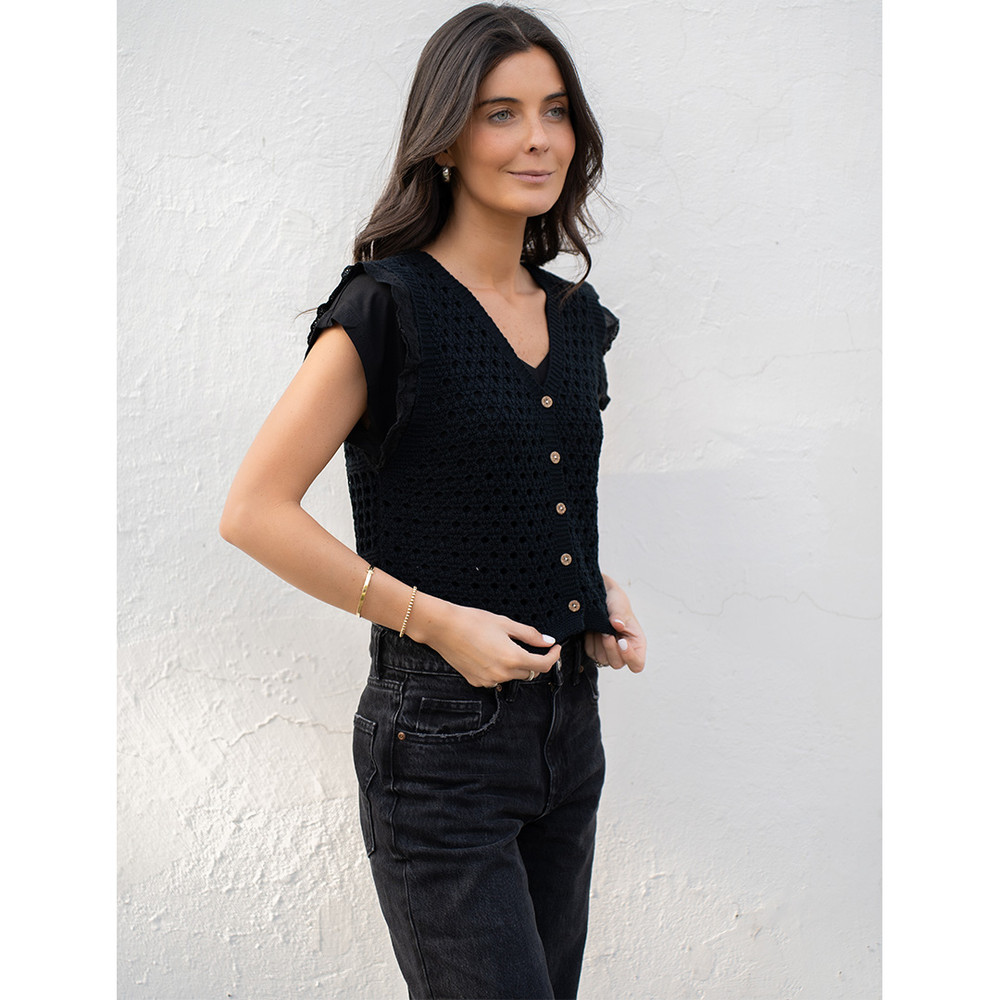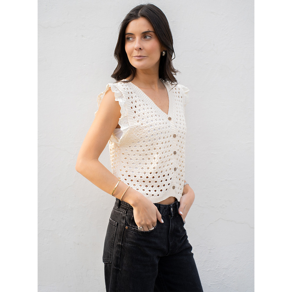 Tejido ideal para polera o chaleco. Sin manga, detalle de vuelitos y abotonado delantero.