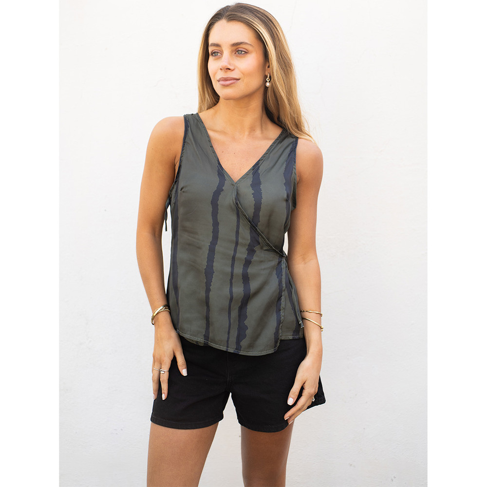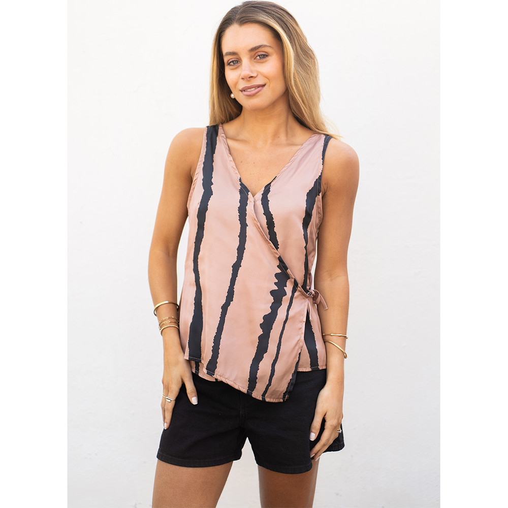 Polera de viscosa estampada sin mangas y cuello en V. Cruzada al lado, se ajusta con argolla de adorno. La modelo mide 1.60 y usa talla S. Lavar a mano y no usar secadora.