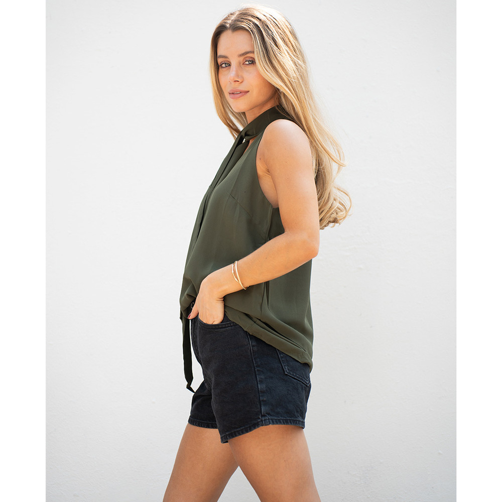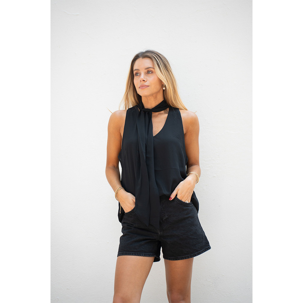 Blusa sin mangas en viscosa. Modelo de caída amplia con escote asimétrico y tiras amplias de anudar en el cuello. Lavar a mano y no usar secadora.