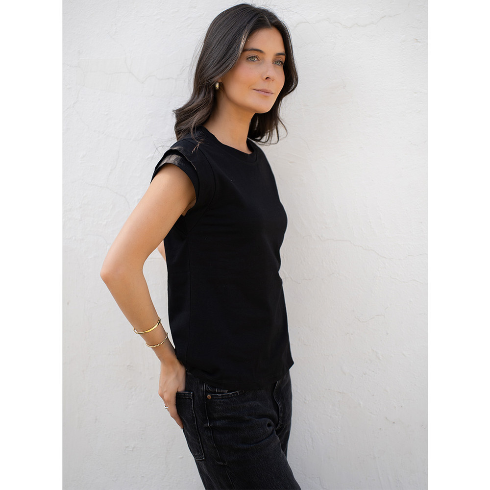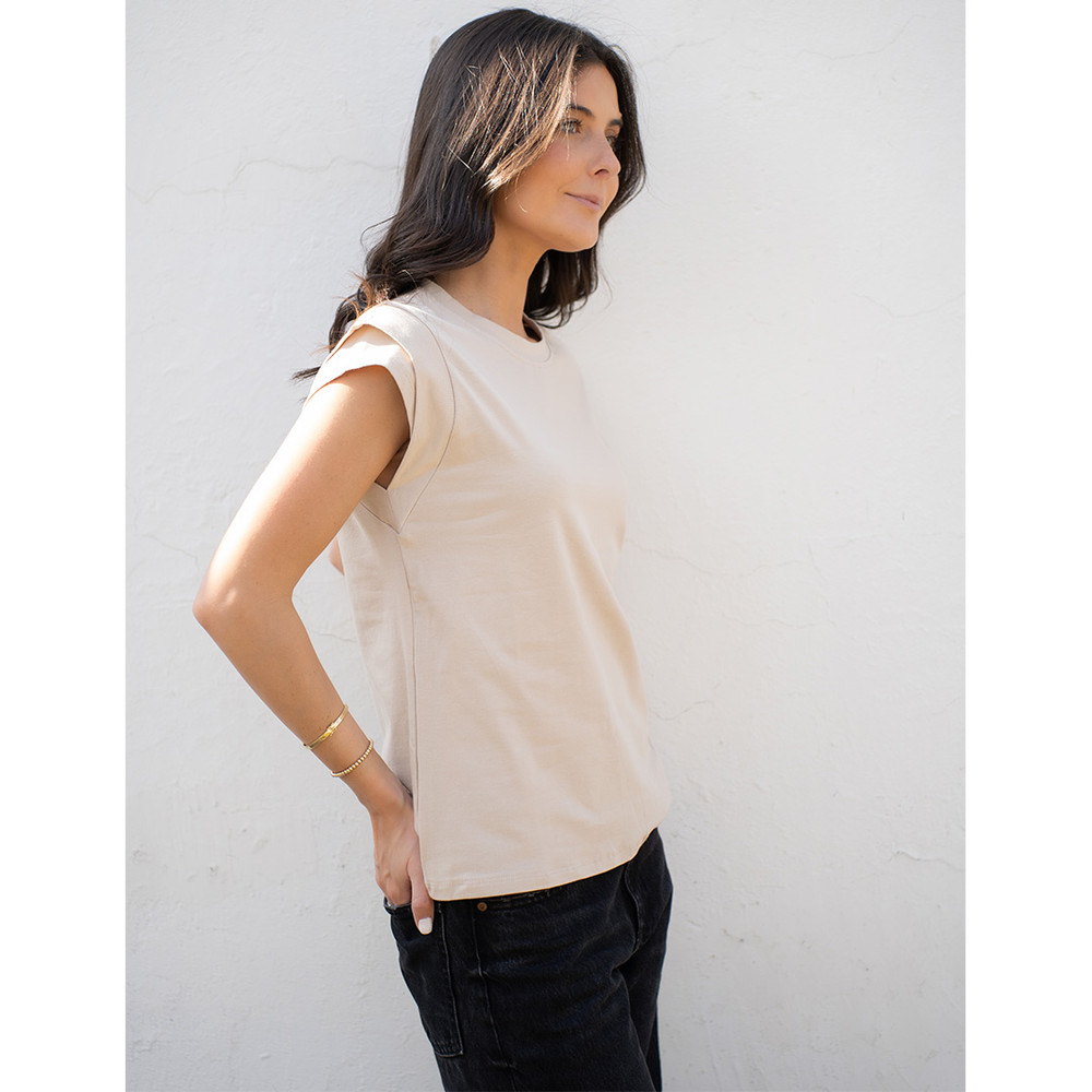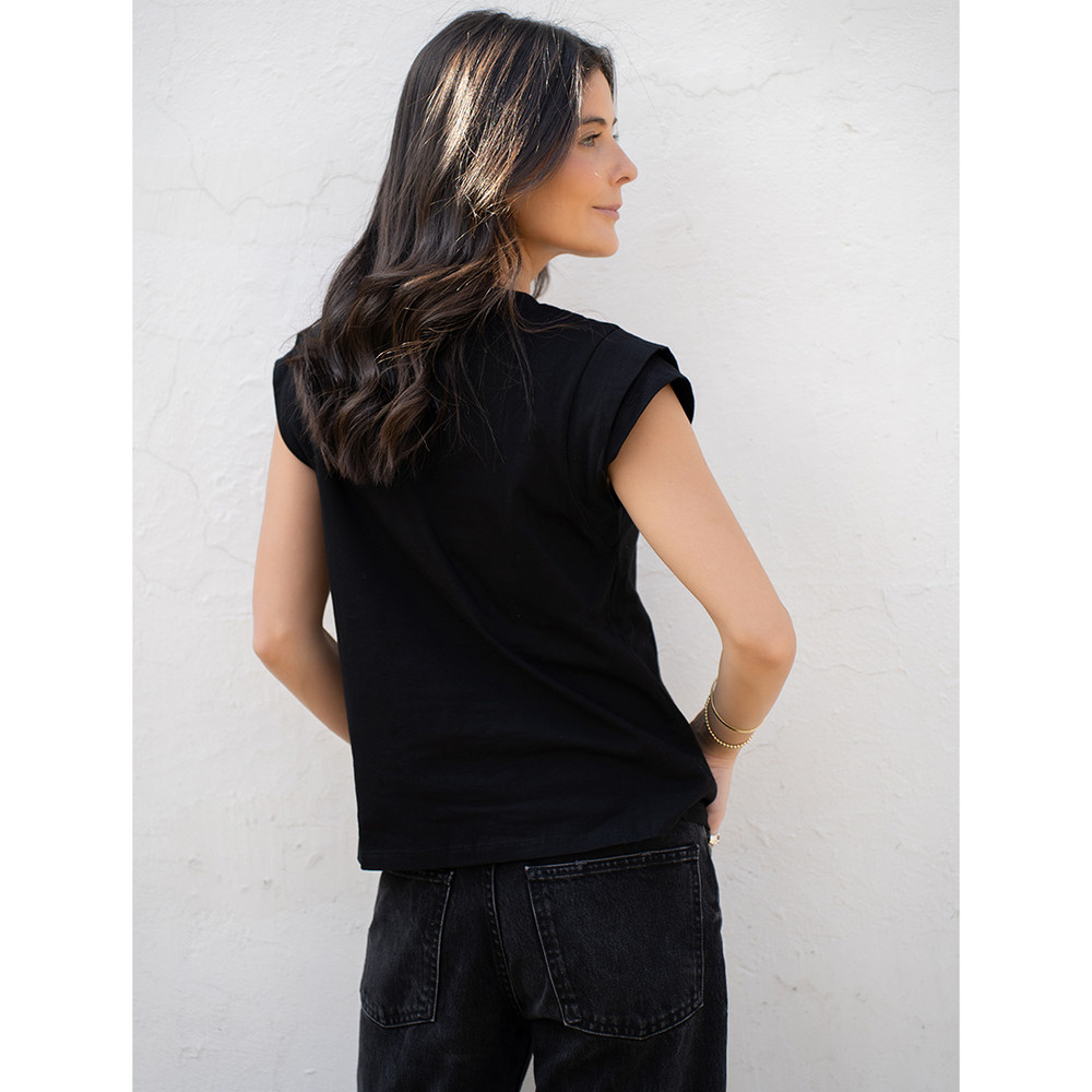 Polera básica con manga semicorta. Cuello redondo con detalle sutil de corte en sus mangas. Disponible en talla S y M.
