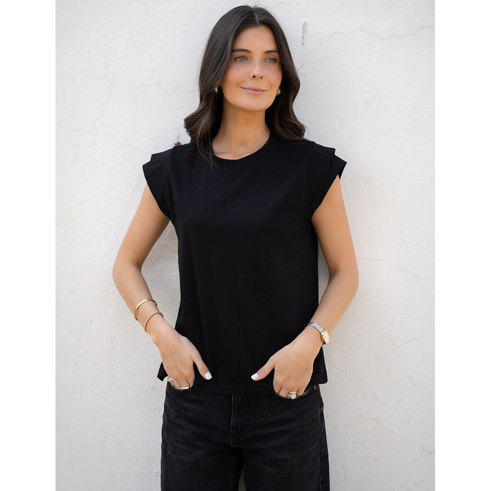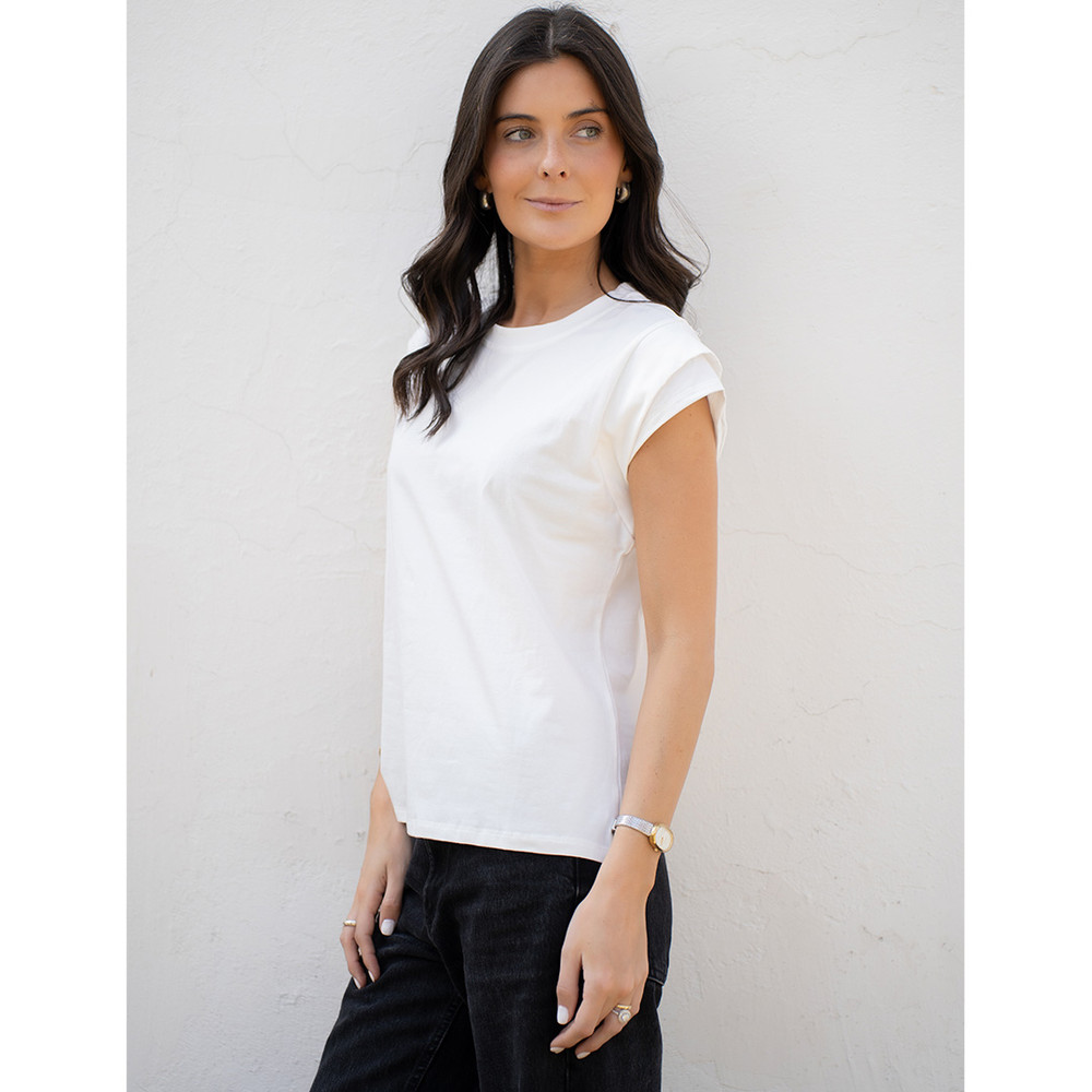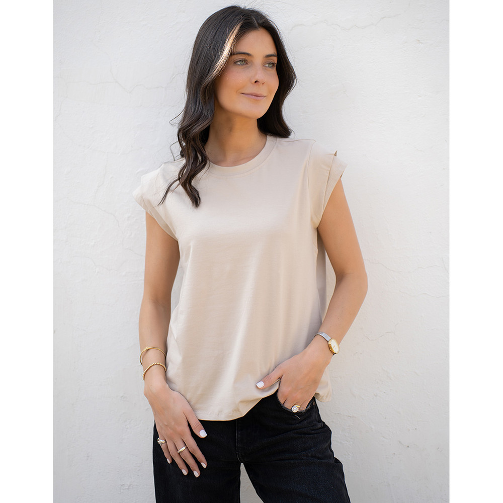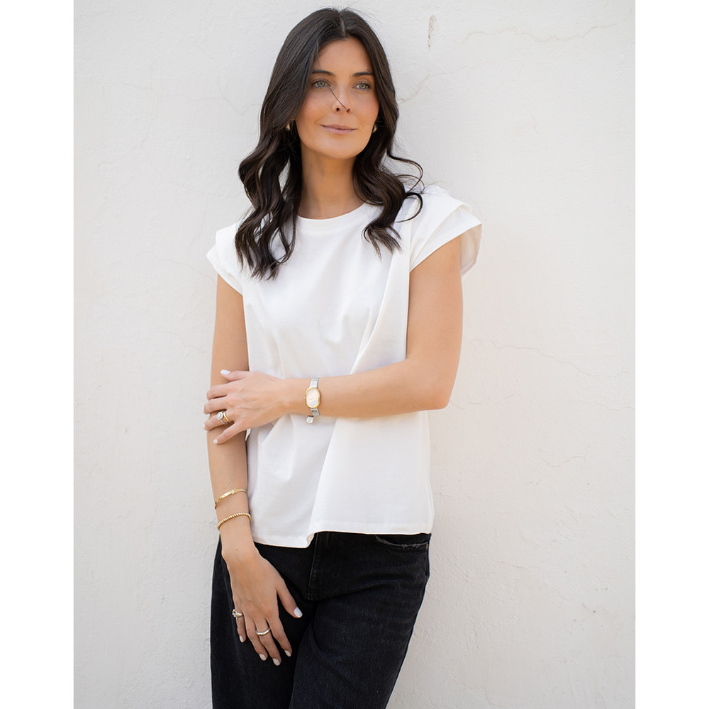 Polera básica con manga semicorta. Cuello redondo con detalle sutil de corte en sus mangas. Disponible en talla S y M.