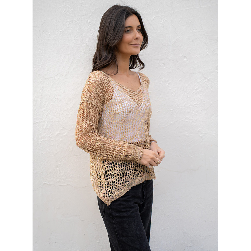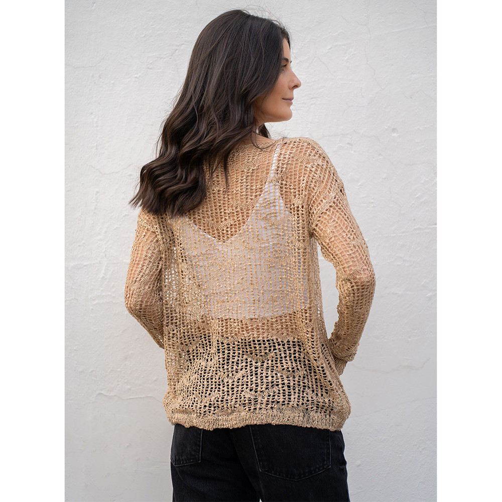 Ligero sweater color cafe de tejido ancho y caída ligera. Manga larga y cuello redondo.