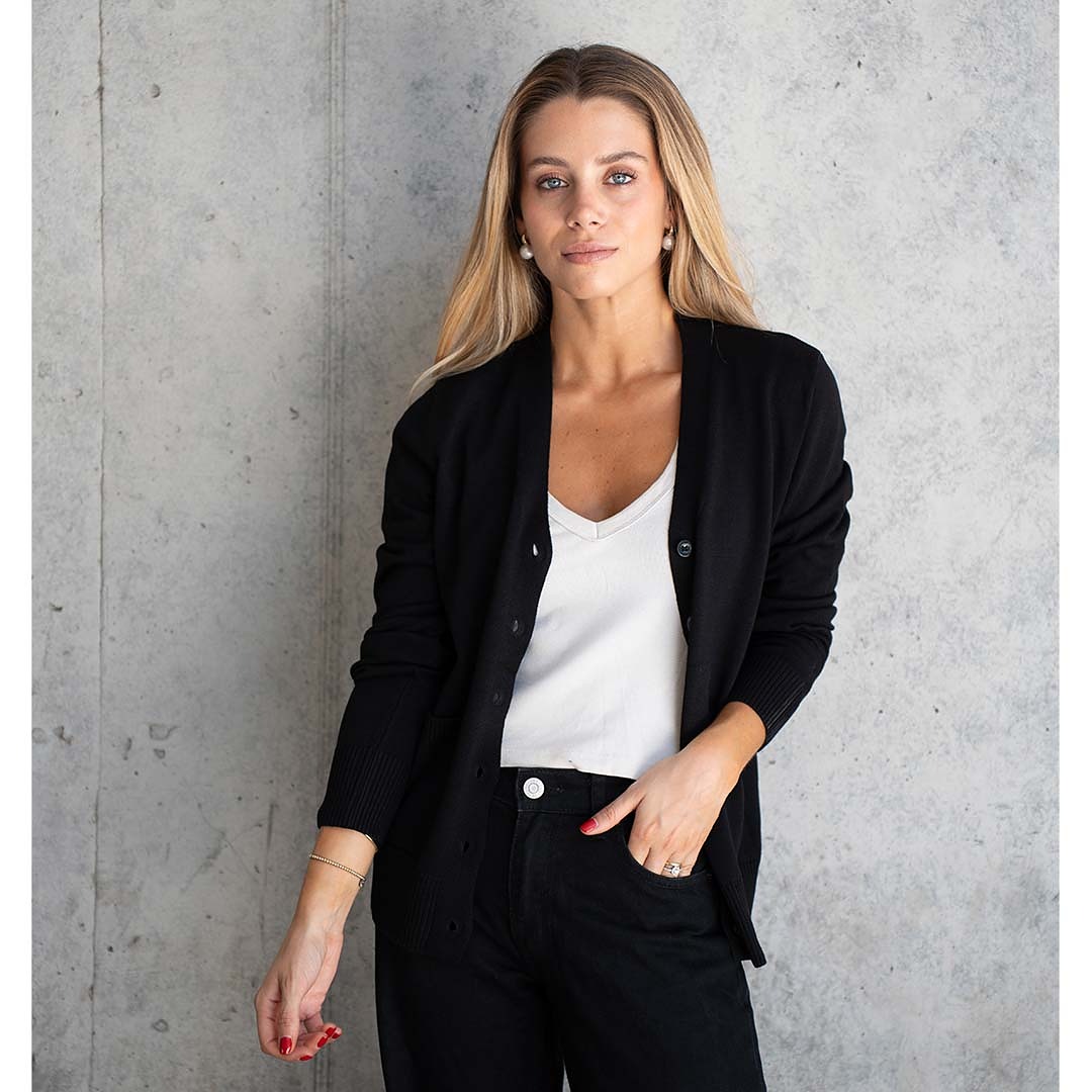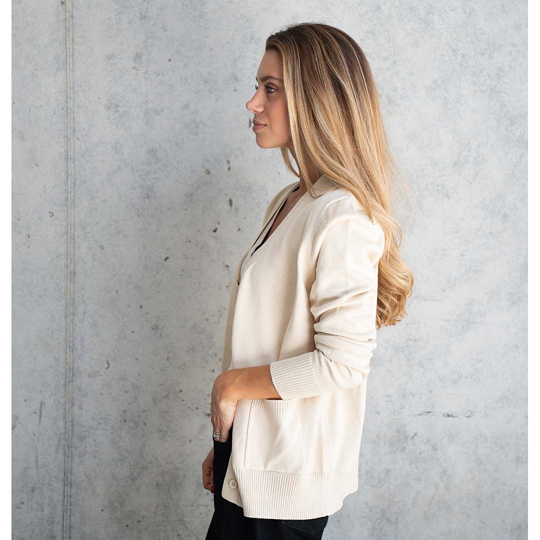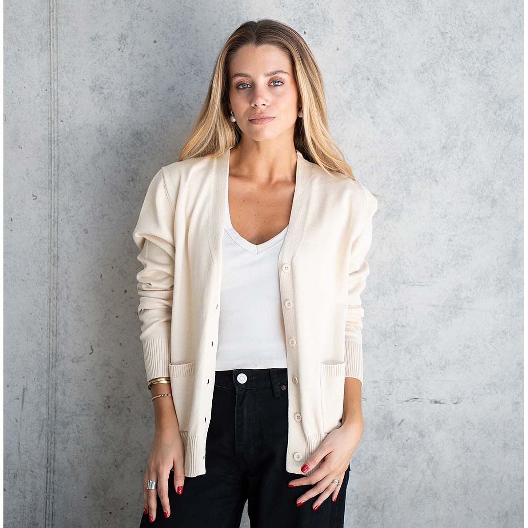 Tejido básico de hilo, abotonado y con bolsillos laterales.