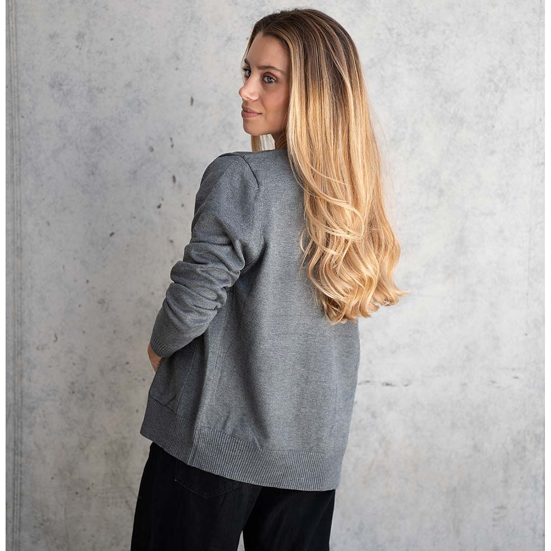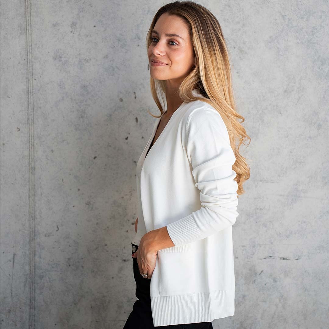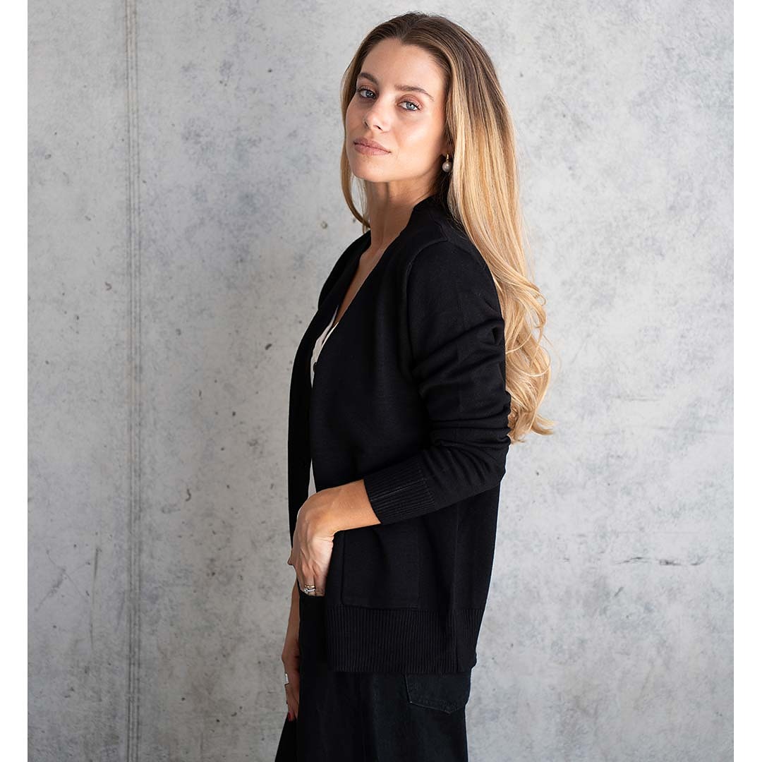 Tejido básico de hilo, abotonado y con bolsillos laterales.