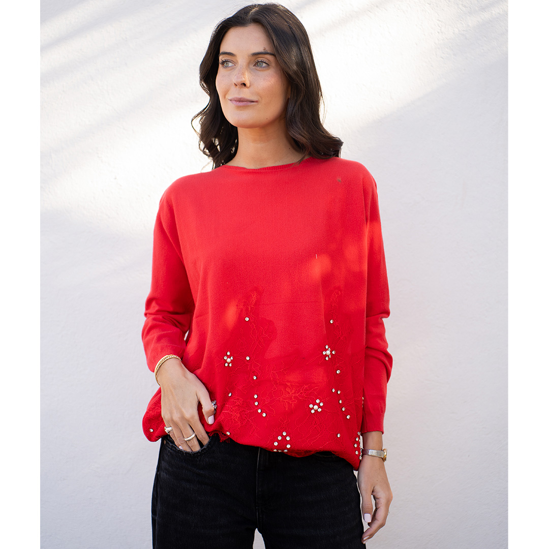 Tejido de hilo básico y con detalle de brillos en su parte de abajo. En negro, rojo y blanco.