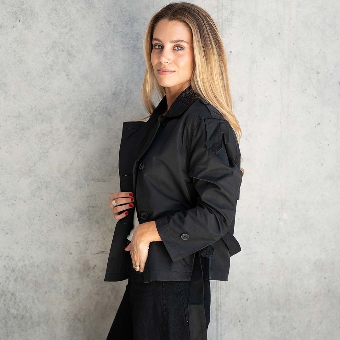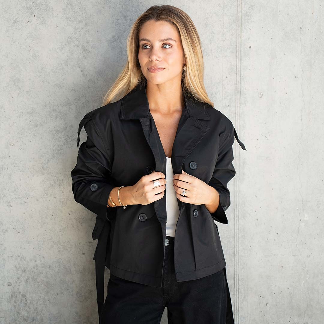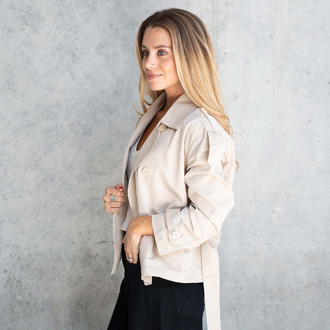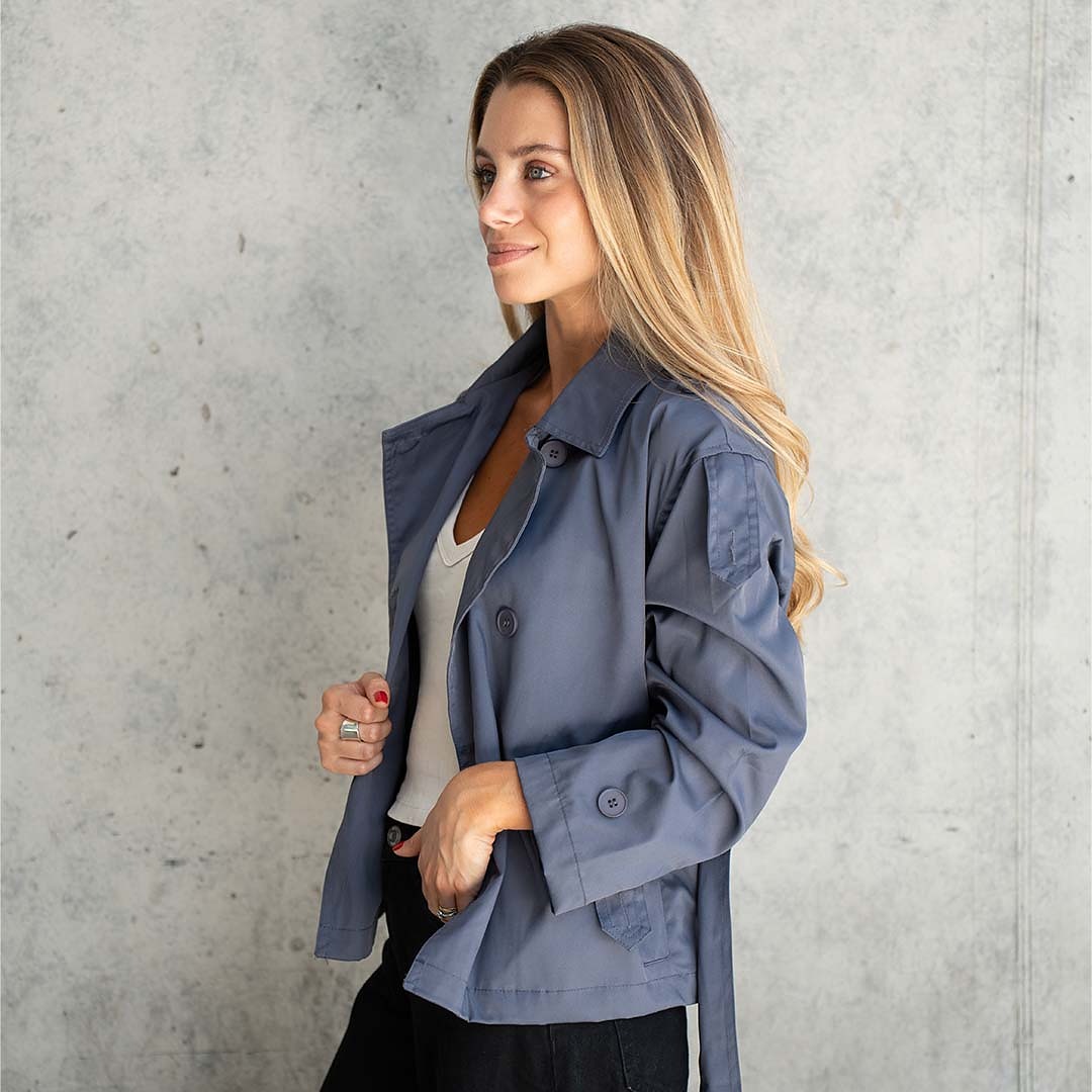 Trench clásico y versátil, con cuello cuello solapa, manga larga, cierre frontal cruzado con doble botonadura y cinturón ajustable para la cintura.