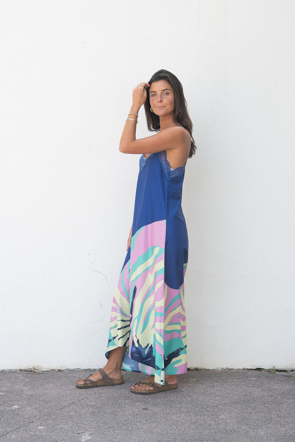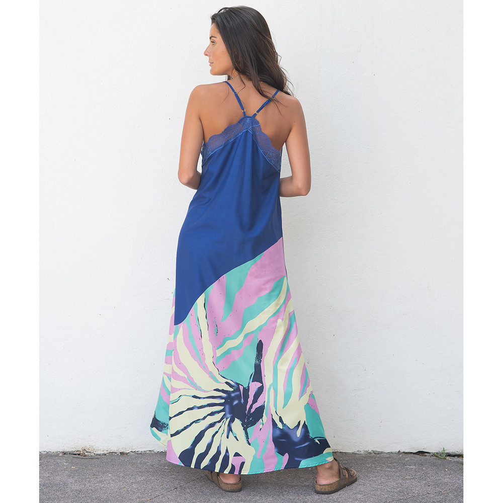 Vestido de viscosa estampada. Colorido y de caída fluida. Detalle de encaje en el escote. Medidas más abajo en Descripción.
