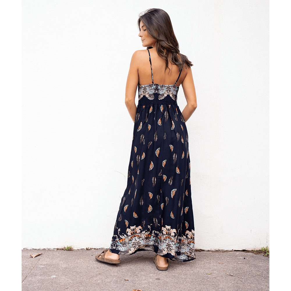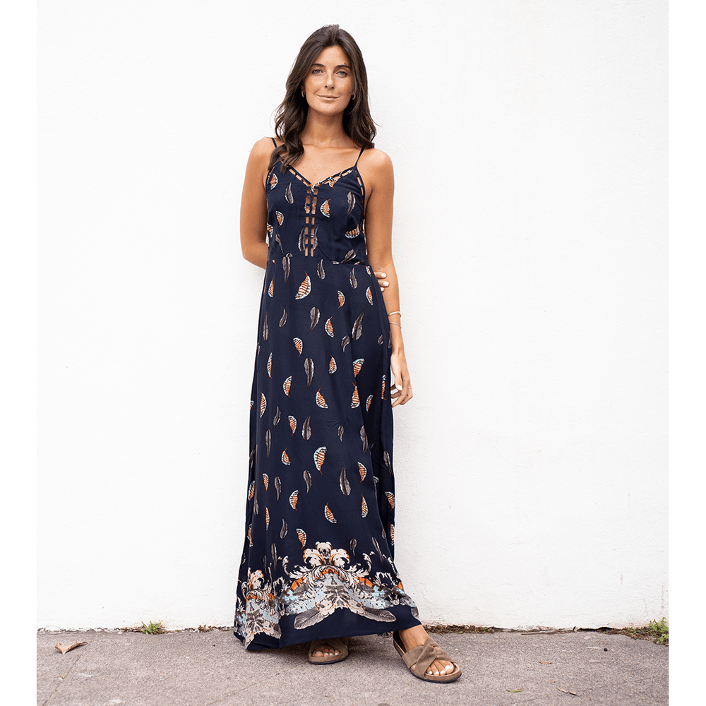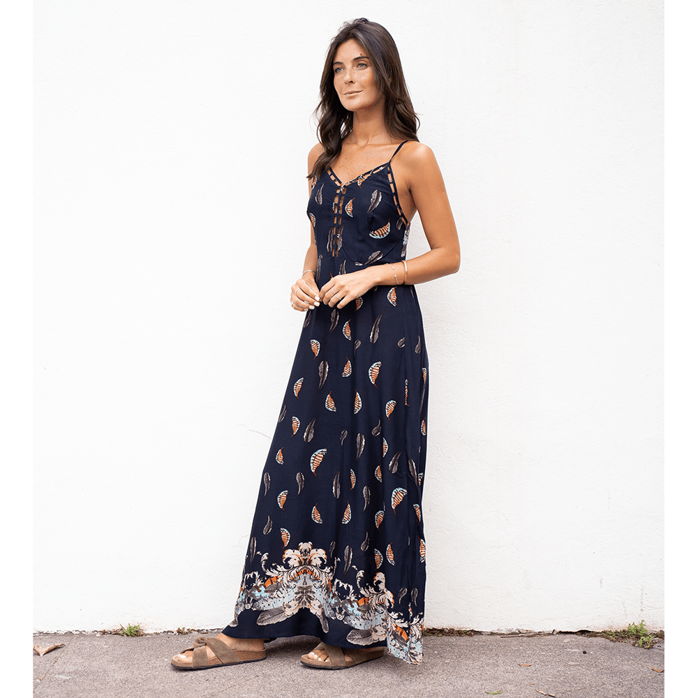 Vestido largo de viscosa estampada. En su escote tiene una tramado de tiritas donde se puede ver la piel, un toque lindo y delicado. Encuentra sus medidas más abajo en características.